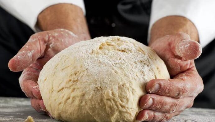 • Vamos realizando movimientos; cogiendo la masa de los costados hacia el centro, con mucha fuerza, repetimos este proceso por 10 minutos. hasta que la masa no se pegue en las manos y quede tal cual la imagen.